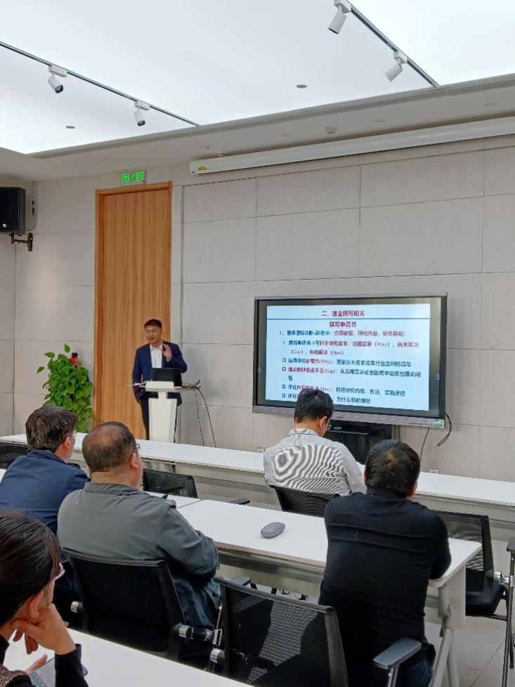 张振华副经理向与会教师传达公司国家自然科学基金申报动员会会议精神, 介绍了2025年全校国家自然科学基金获批情况、2026年全校国家自然科学基金政策变化、工作目标、组织措施。