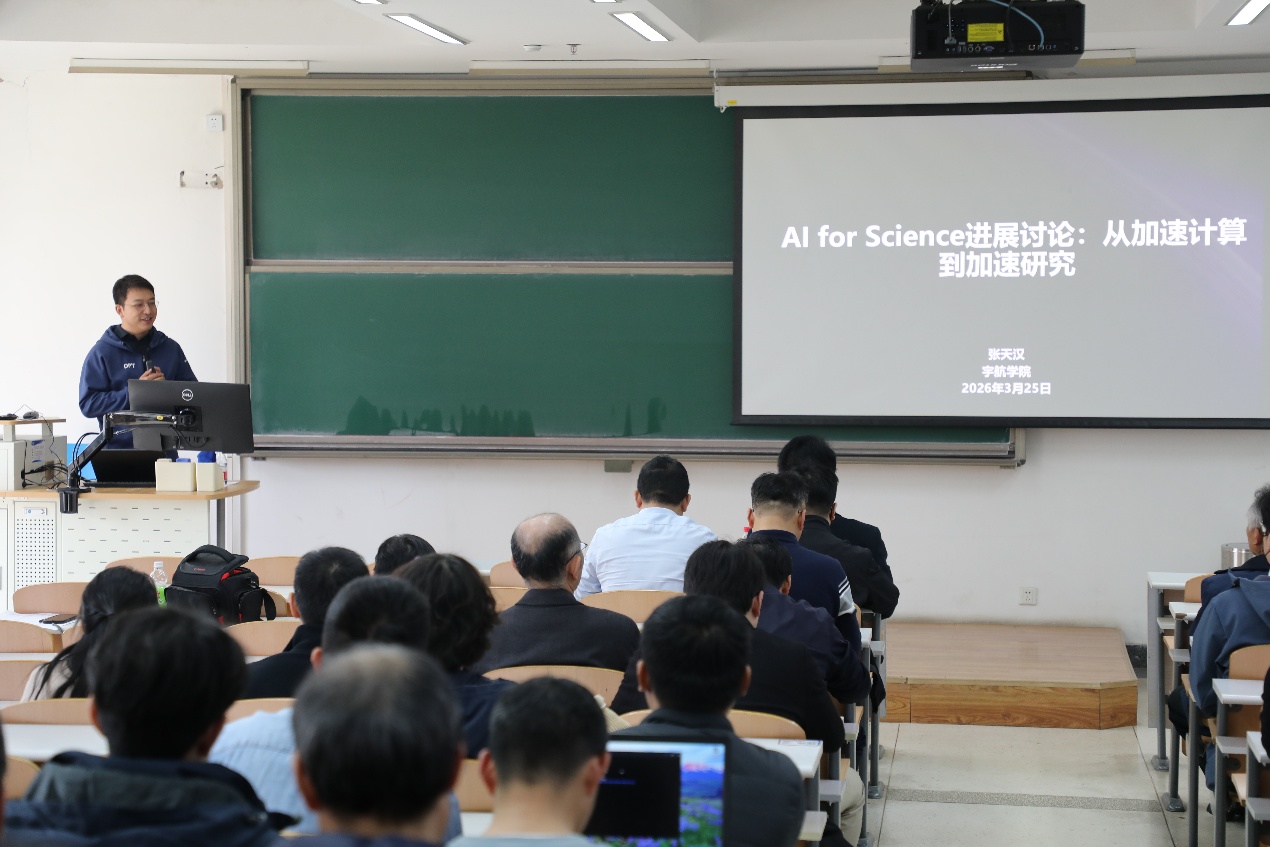 为紧跟人工智能发展浪潮,探索前沿技术在科研领域的深度融合与应用,十大正规买足球网站教师发展分中心于2026年3月25日下午13:00在沙河校区J5-102教室成功举办人工智能专题讲座。特邀公司宇航推进系张天汉老师为全院教师作题为“AI for science进展讨论:从加速计算到加速研究”的精彩分享,讲座由公司党委书记徐亚军主持。