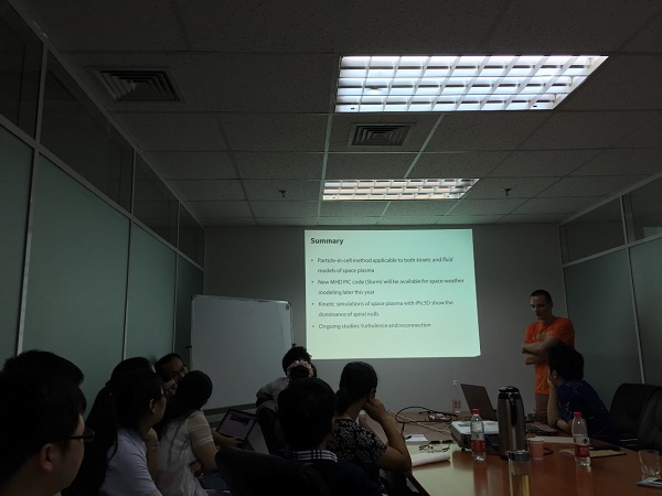 报告的主要内容包括两部分,第一部分是动力学模型中PIC方法的应用,第二部分是流体模型中PIC方法的应用。在动力学模型中,Vyacheslav Olshevsky主要介绍了用PIC方法来模拟出磁零点和磁场位形。在流体模型中,他主要介绍了PIC方法在空间天气中的应用。Vyacheslav Olshevsky表示接下来将进行湍动和磁重联的研究。