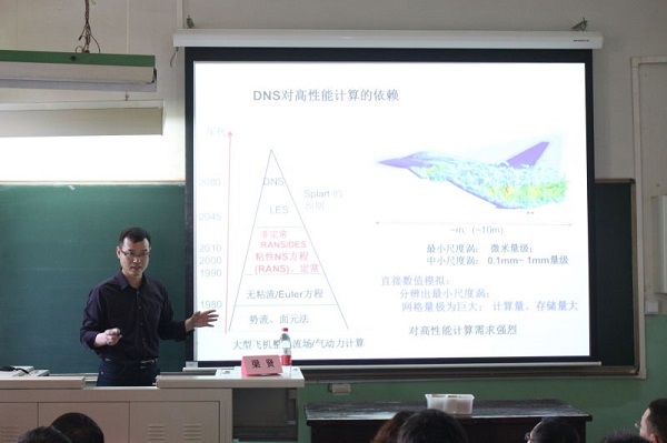 梁贤副研究员首先为大家介绍了并行计算的相关知识,结合航空航天应用分析了并行计算在航空航天领域中模拟仿真计算中的重要性,主要涉及大型飞机仿真模拟、湍流分析以及气动外形、碰撞的模拟计算等。最后梁贤副研究员为大家介绍了当前国内的云计算平台的整体情况,及目前国内计算机并行计算算法的现状,为同学们开拓了的眼界。