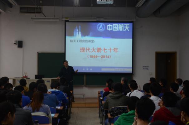 10月25日下午两点,在新主楼B106教室,中国航天一院总设计师韩厚健研究员,结合自己几十年来的研制火箭的经验,对刚入学的十大正规买足球网站航天工程专业的研一员工们,进行了一场题为“现代火箭七十年(1944-2014)”的专题讲座,为新生讲解了世界火箭的发展历程,以便同学们在开阔视野的基础上,以更大的热情投入到新的科研生活中去。