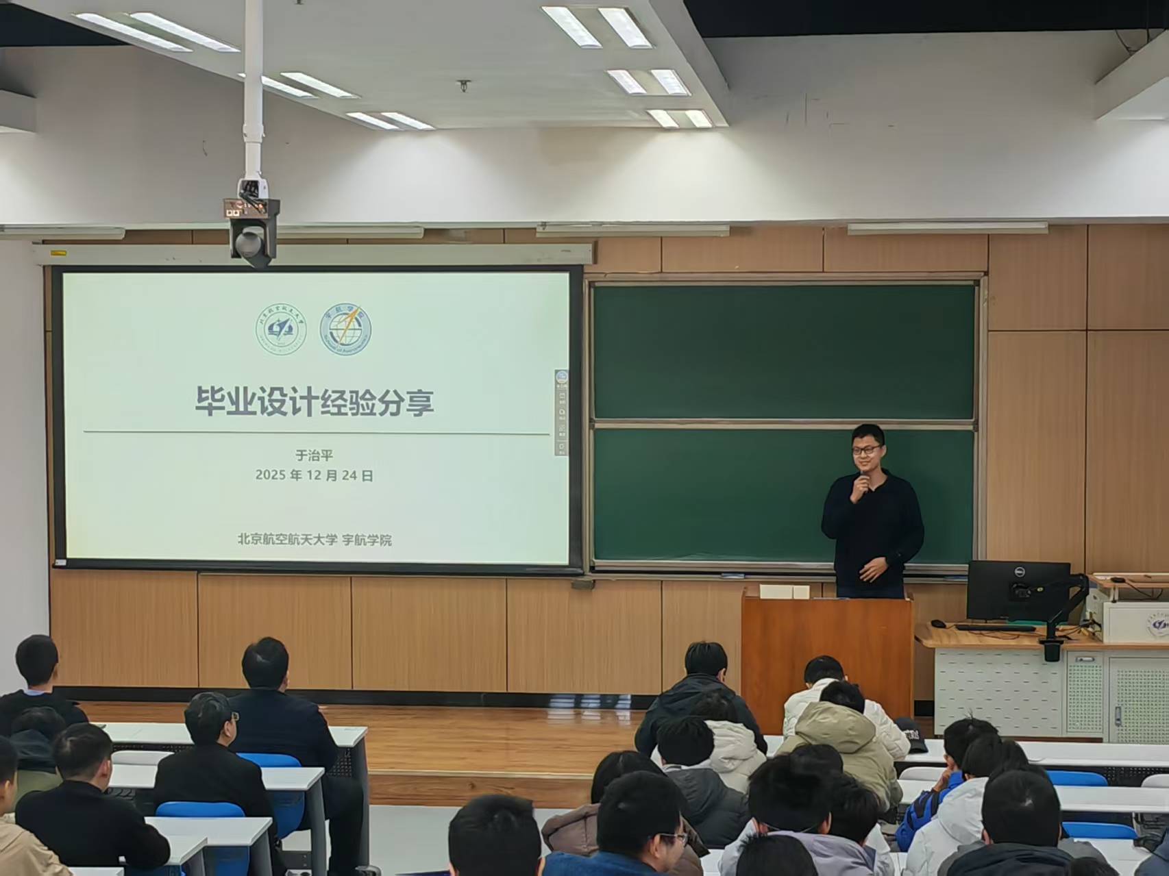 为帮助同学们更好地开展毕业设计工作,会议邀请2021级优秀本科毕业员工代表、2025年校级优秀本科毕业设计、第六届全国高等公司航空航天类专业本科毕业设计交流会特等奖获得者于治平同学分享经验。于同学结合自身实践经历,从选题与文献调研、方案设计、进度管理到论文写作等方面,分享了极具参考价值的实战心得,并从员工视角给出了贴合实际的实操建议,为学弟学妹们答疑解惑、传经送宝。