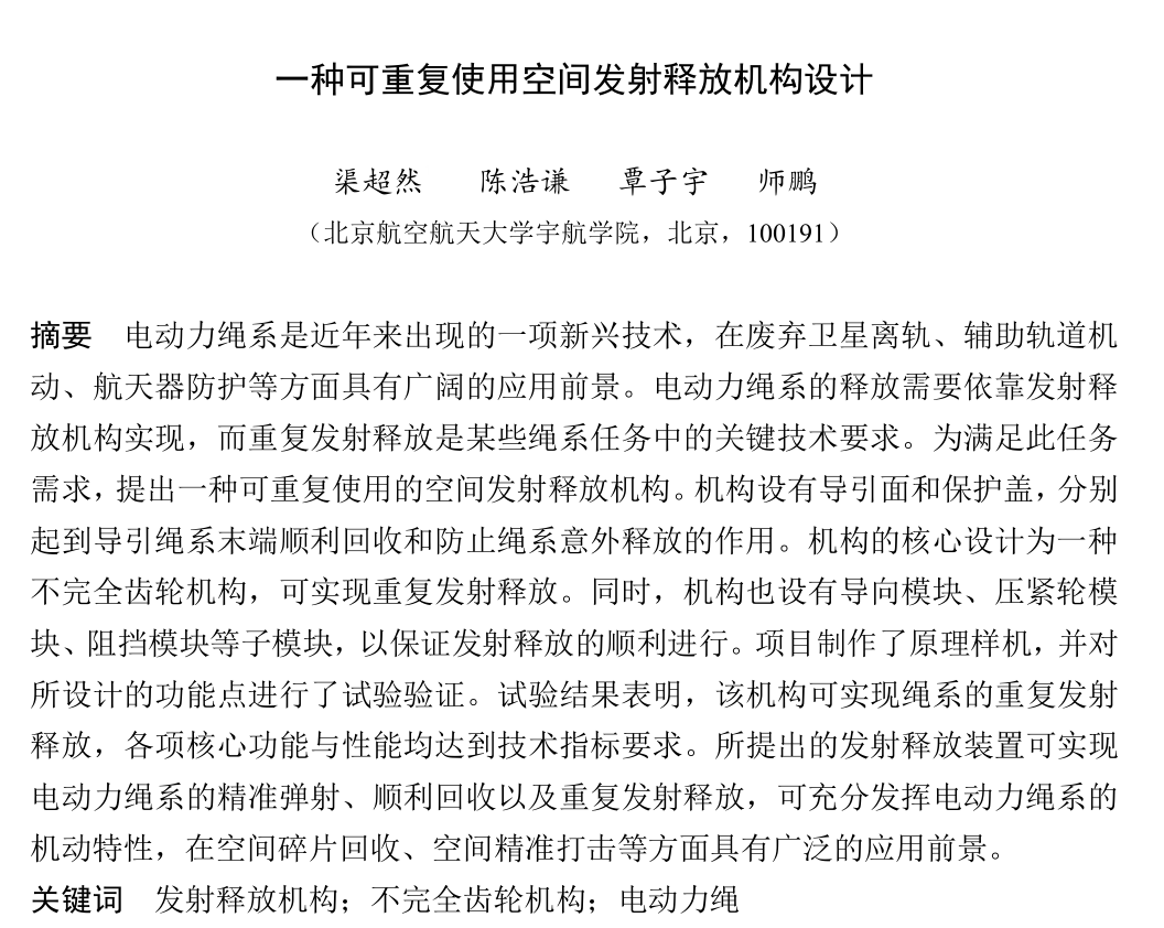 十大正规买足球网站本科生渠超然提交的论文是在北航第三十一届“冯如杯”员工学术科技作品竞赛获奖作品“可重复使用空间发射释放装置”基础上的拓展性研究成果。该论文提出了一种可重复使用的空间发射释放机构。机构的核心设计为一种不完全齿轮机构,可实现重复发射释放。同时,机构也设有导向模块、压紧轮模块、阻挡模块等子模块,以保证发射释放的顺利进行。研究团队在制作原理样机的基础上对所设计的功能点进行了试验验证。试验结果表明,所提出的发射释放装置可实现电动力绳系的精准弹射、顺利回收以及重复发射释放,可充分发挥电动力绳系的机动特性,在空间碎片回收、空间精准打击等方面具有广泛的应用前景。