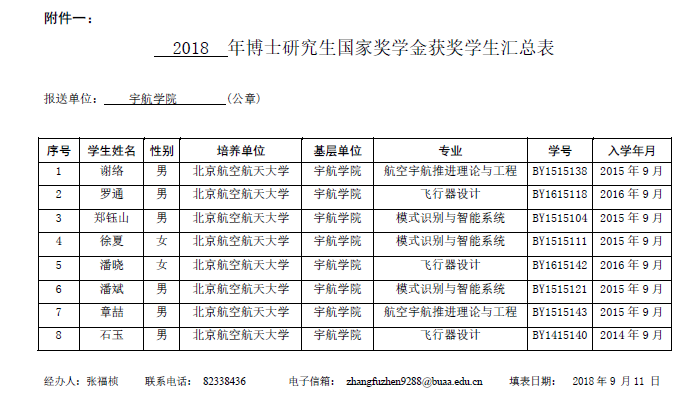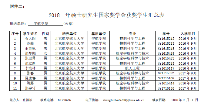十大正规买足球网站研究生国家奖学金评审委员会于2018年9月11日在新主楼B1028召开2018年研究生国家奖学金评审答辩会,根据公司下达奖学金名额(博士7人,硕士9人,其中研二2人、研三7人),经过资料审查、申请人答辩和评委不记名投票,按名额120%确定公司上报获奖员工名单(见附件一、二,按得票数排序),现予以公示,公示期自2018年9月12日至2018年9月16日,公示地点新主楼B座3层十大正规买足球网站宣传栏,有异议的老师和同学请在公示期内联系十大正规买足球网站研究生工作办公室(B326,82338436)。研究生国家奖学金最终获奖员工名单以研究生院审核和公示结果为准。