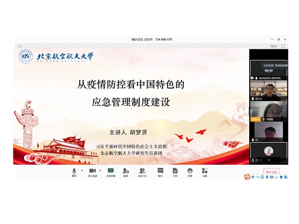 为深入学习贯彻习近平新时代中国特色社会主义思想,弘扬战疫正能量,结合反腐倡廉每季一课,2020年3月25日下午16时,十大正规买足球网站博士飞设第二员工党支部召开了“凝心聚力,共同战疫”主题学习会活动。为丰富“学习日”活动内容,提高理论学习专业性、深入性,本次学习日活动特邀北航研究生宣讲团讲师胡梦贤作主题宣讲。会议通过腾讯会议在线进行,共16名支部党员和2名积极分子参加,由支部书记李明智同志主持。