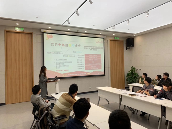 李明智同志首先领学了《中国共产党第十九届中央委员会第四次全体会议公报》,同志们认真听取了这次汇报。十九届四中全会审议通过了《中共中央关于坚持和完善中国特色社会主义制度、推进国家治理体系和治理能力现代化若干重大问题的决定》,这是党的历史上首次用一次中央全会专门研究国家制度和国家治理问题。全会公报用“13个坚持”总结了我国国家制度和国家治理体系具有多方面的显著优势,全会第一次系统描述中国特色社会主义制度的“图谱”,提出了国家治理体系和治理能力现代化分“三步走”的总目标。之后,李明智同志对党员同志结合自身科研、工作情况深入学习十九届四中全会精神进行了动员。
