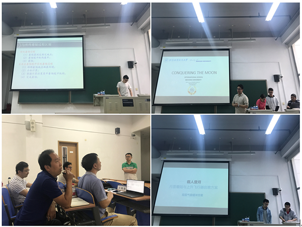 随后,部分参赛同学在会上介绍自己的项目方案。在此次讨论会中,一共有四组同学展示了自己的方案,展示的方案分别有着重于月面降落和上升飞行器的设计方案、利用气囊降落的飞行器设计方案和从地球到月球飞行器转移的方案。在讨论会进行的过程中,老师们也对四组同学的方案提出了自己的意见和建议,老师们着重强调,在方案设计过程中可以大胆一些,对载人月面降落过程可以提出更多的想法,不要拘泥于工程上是否可行。